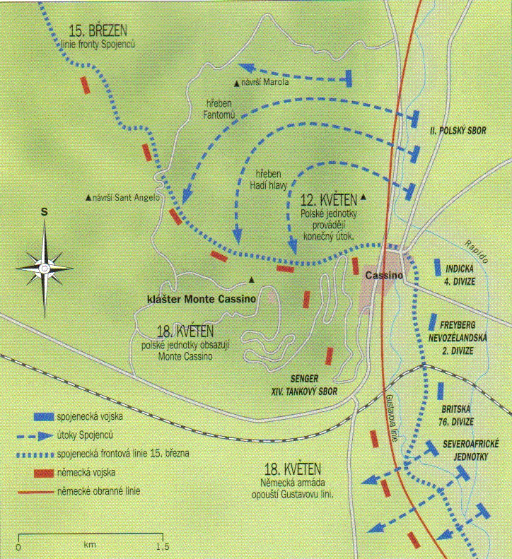 Na jar sa v tejto oblasti počasie zlepšilo. Bola zahájená hlavná ofenzíva proti nemeckej Gustavovej línii, v ktorej Monte Cassino predstavovalo oporný bod. V noci 1. mája bola zahájená mohutná delostrelecká podpora a po nej nasledoval postup spojeneckých divízií pozdĺž línie od Cassina až po morské pobrežie. Severoafrické jednotky uskutočnili prielom do údolia Liri a Gustavova línia bola prelomená. Dobytie kláštora Monte Cassino bolo prenechané 2. poľskému zboru, ktorému velil generál W. Anders. Zbor mal 50 000 mužov a bol zložený z poľských vojakov, ktorí po rozdelení Poľska medzi Nemecko a Sovietsky zväz unikli do zahraničia. Túžili sa Nemcom pomstiť a boli rozhodnutí ich pozície dobyť.